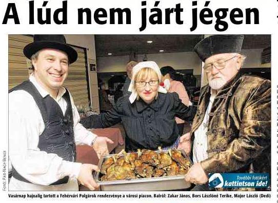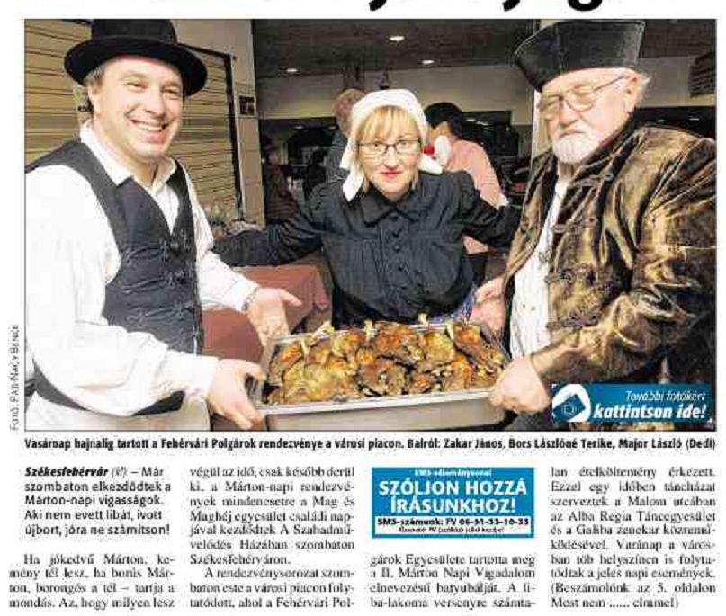A Márton-napi rendezvénysorozat szombaton este a városi piacon folytatódott, ahol a Fehérvári Polgárok Egyesülete rendezte meg a II. Márton Napi Vigadalom elnevezésû batyubálját. Vasárnap a megyei múzeumban került sor a Fehérvári Polgárok Egyesülete és a Szent István Király Múzeum közös rendezvényére. Ünnepi köszöntot mondott Gulyás Oldal Tamás, az egyesület elnöke és Földi Zoltán, a humán közszolgálati szakbizottság elnöke. Ezt követoen Buza István tartott eloadást Szent Márton napjáról a néphagyományokban címmel, majd a Szent Márton-napi újbor jelentoségét ismertette Hegedûs György, a Noé-Hegyi Szent István Borlovagrend fopohárnoka, a „Királyi Város Borásza” cím birtokosa. A rendezvényen, ahol egy, az interneten meghirdetett – Márton-napi – rajzverseny pályamûveibol is kiállítás nyílt, felléptek a felsovárosi és a széna téri általános iskolások is, majd átadták a Márton-napi gyerekrajz pályázat díjait. Aversenyre összesen 55 alkotás érkezett. Az alsósok közül Nagy Napsugár lett az elso. A második Pataki Marcell, a harmadik Lórodi Luca volt. A felsosök közül Szabó Vaneszszáé lett az elso hely, ot pedig Csûri Fanni Noa és Varga Laura követte. A nap fénypontja tagadhatatlanul a délben érkezo ludaskása és a Hegedüs Családi Borászat újborai jelentették. A vígkedélyû kóstolás közben a múzeum szakértoi tárlatvezetést is biztosítottak. A nap záró eseményére este az Öreghegyen került sor, ahol egyszerre két helyszínrol induló lámpás felvonulás indult. A séta az Öreghegyi Közösségi Házig tartott, ahol késoi vacsora és táncház várta az érkezoket.